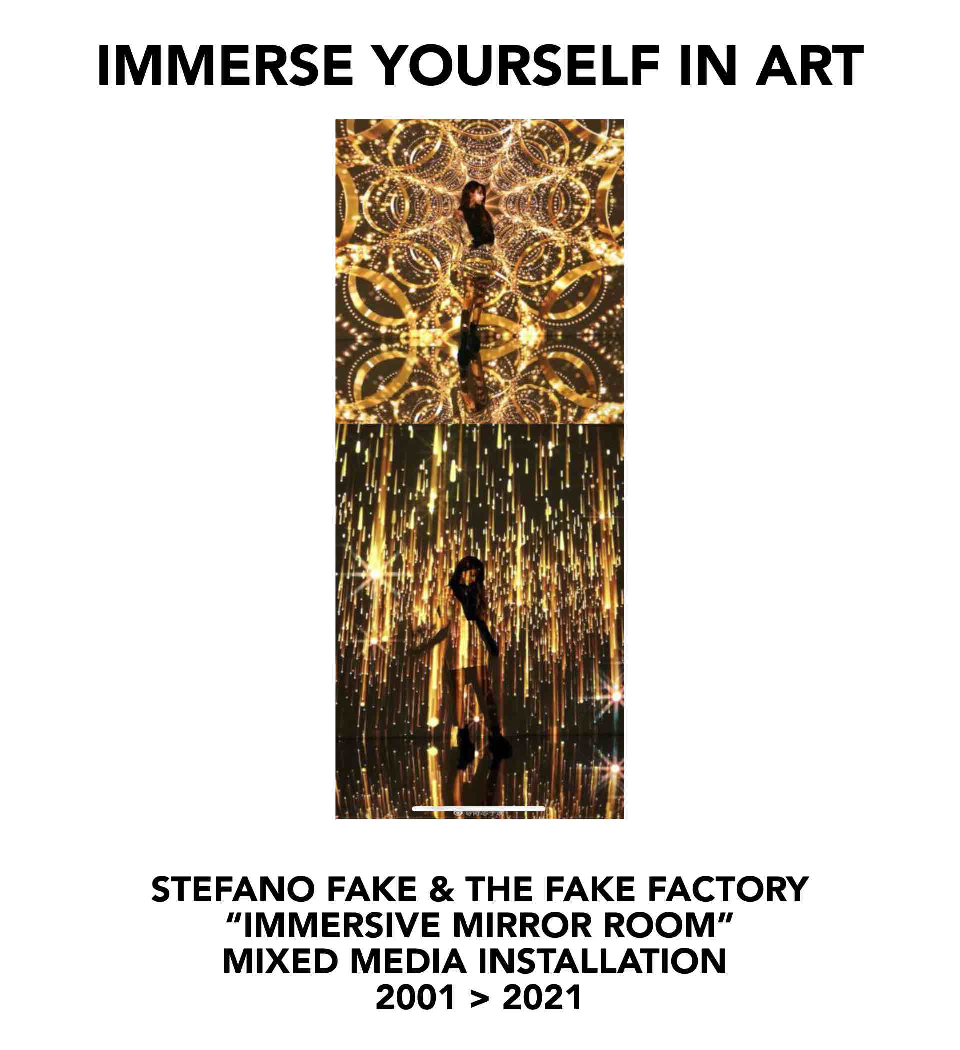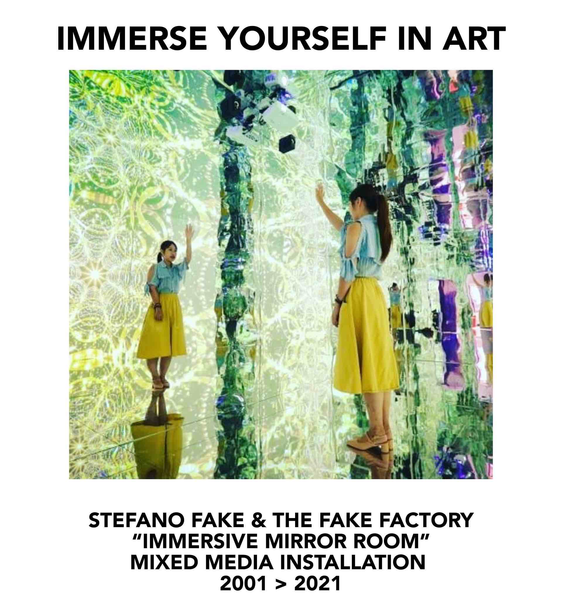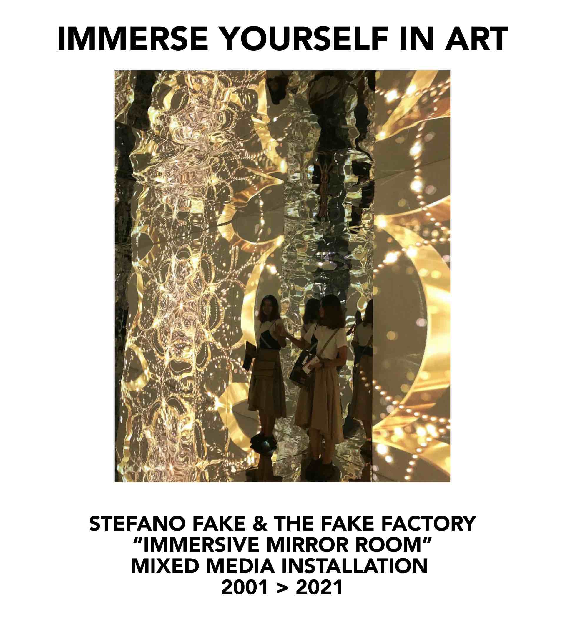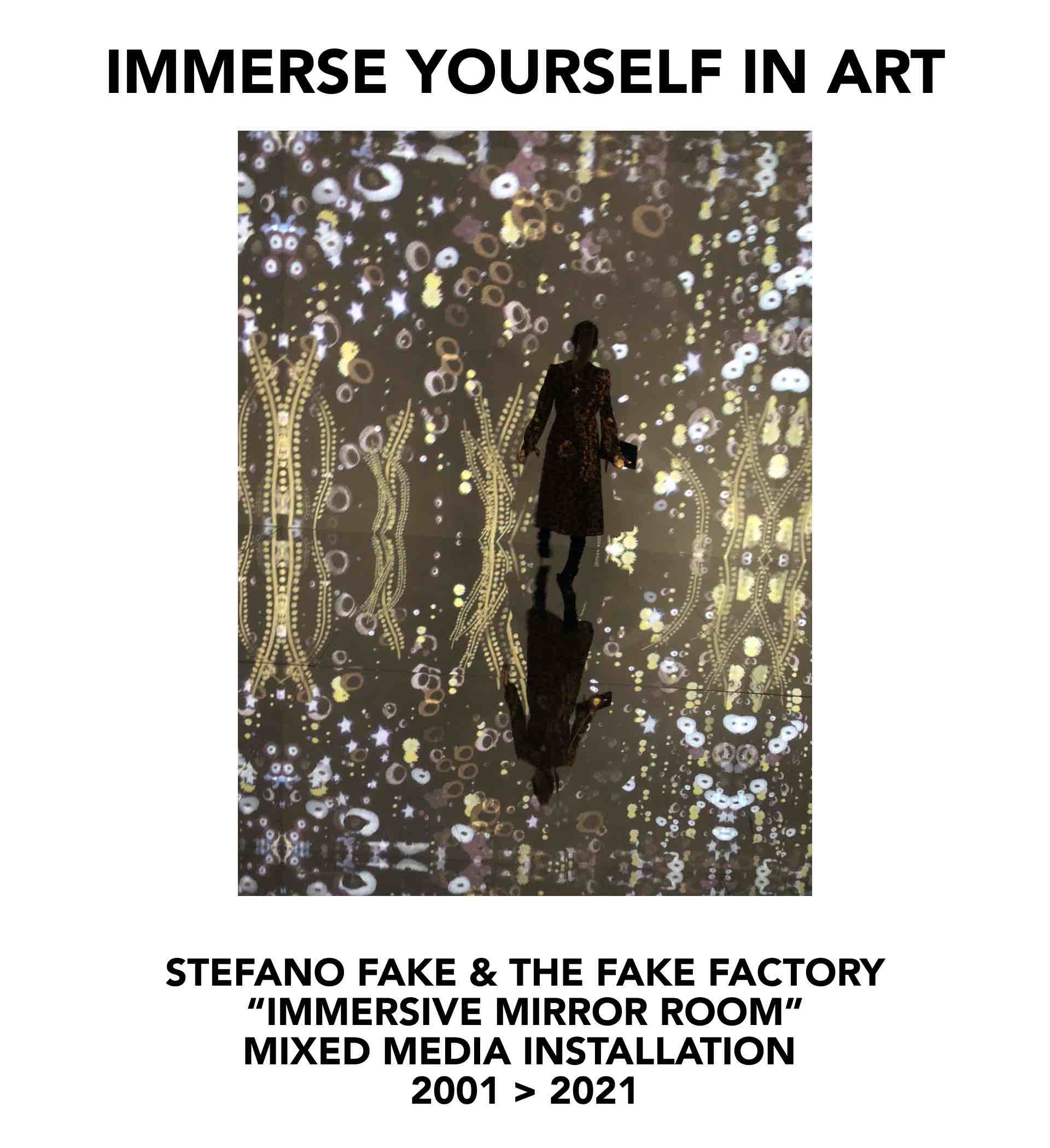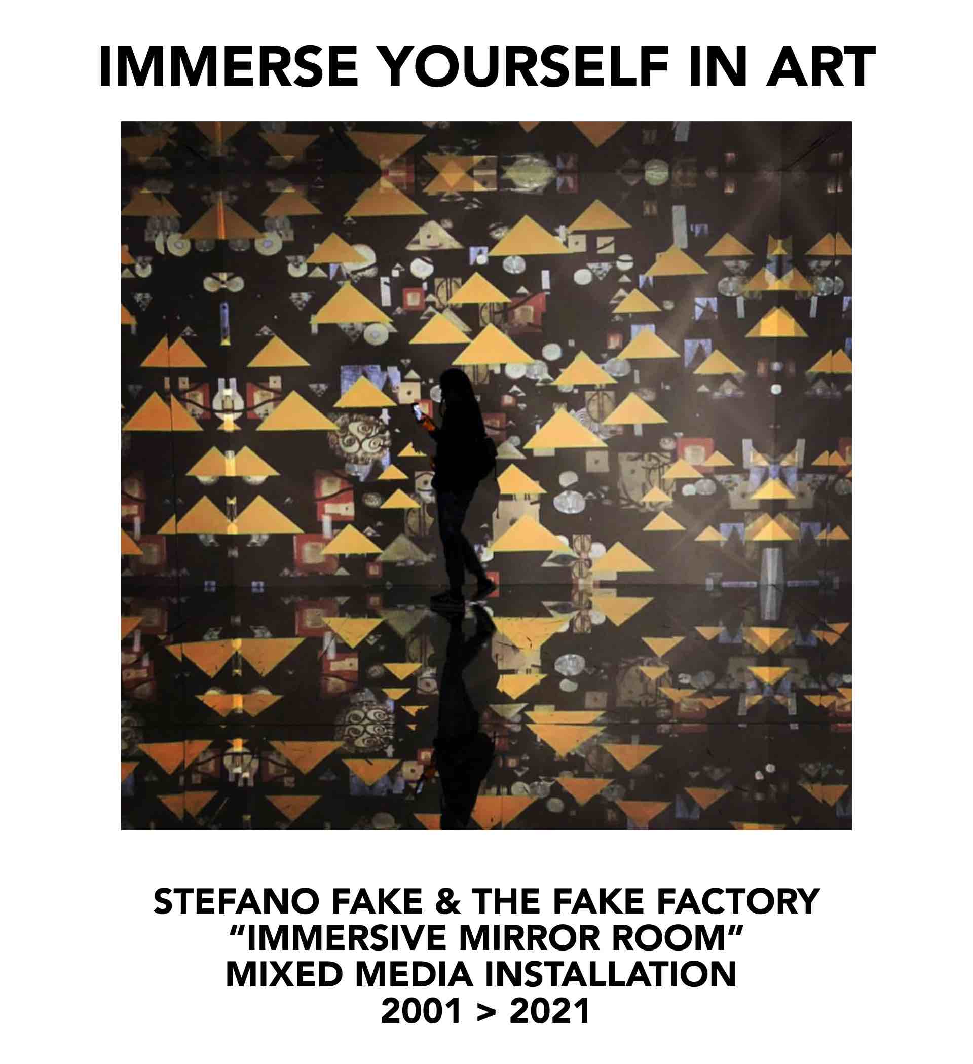 L’installazione “Immersive Mirror Room” è stata creata dall’artista italiano Stefano Fake nel 2001. Già nel 2001 ha iniziato a sviluppare stanze immersive, molto prima che il concetto diventasse una tendenza globale. Le sue immersive mirror rooms hanno attratto milioni di visitatori nel corso degli anni, contribuendo a definire il linguaggio dell’arte digitale e immersiva. Questa innovativa opera d’arte è stata esposta in varie forme sia in Italia che a livello internazionale, all’interno di festival, eventi e mostre innovative. Dal 2001 ad oggi, milioni di persone hanno visitato le immersive mirror rooms create da Stefano Fake & The Fake Factory.
