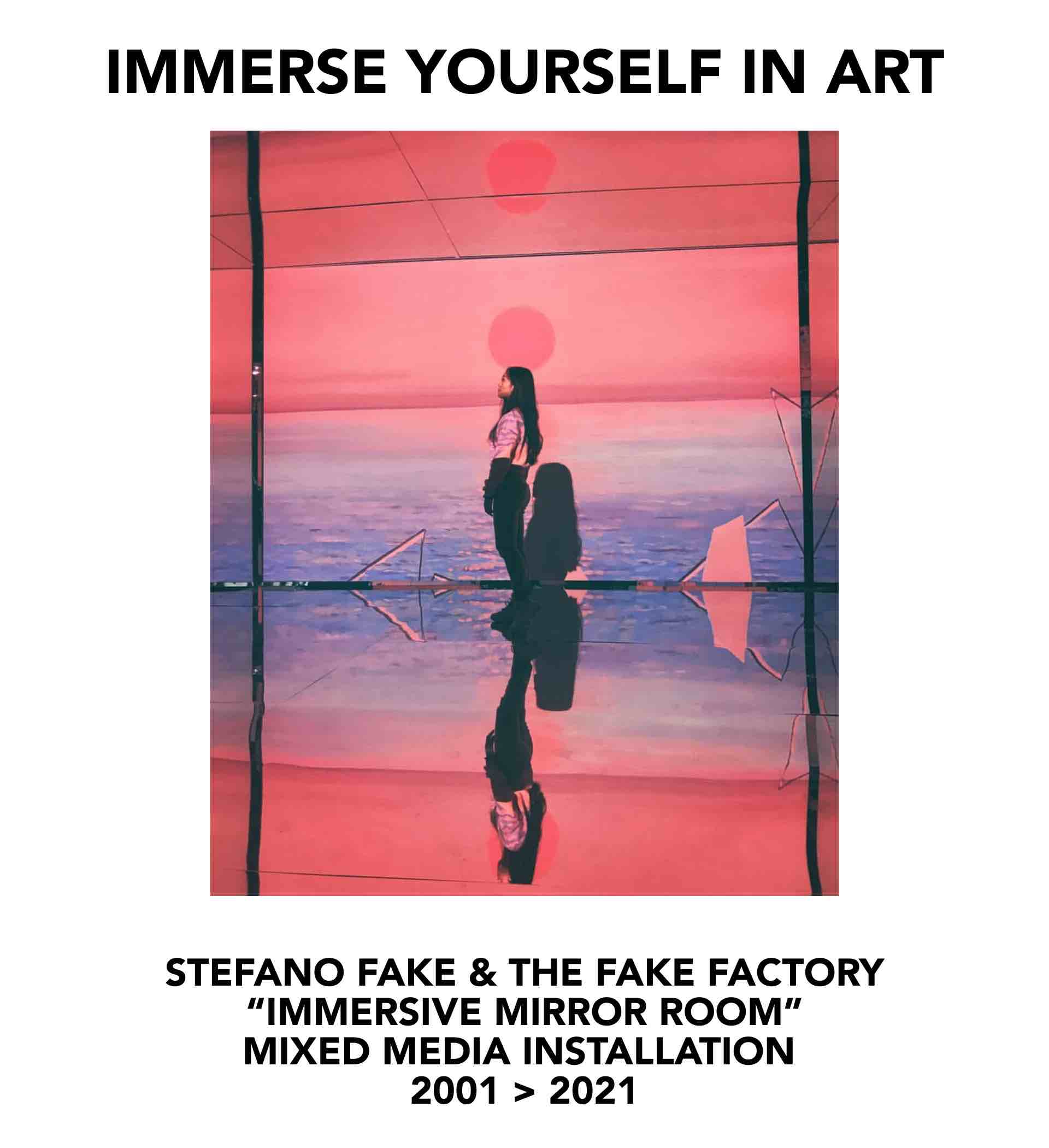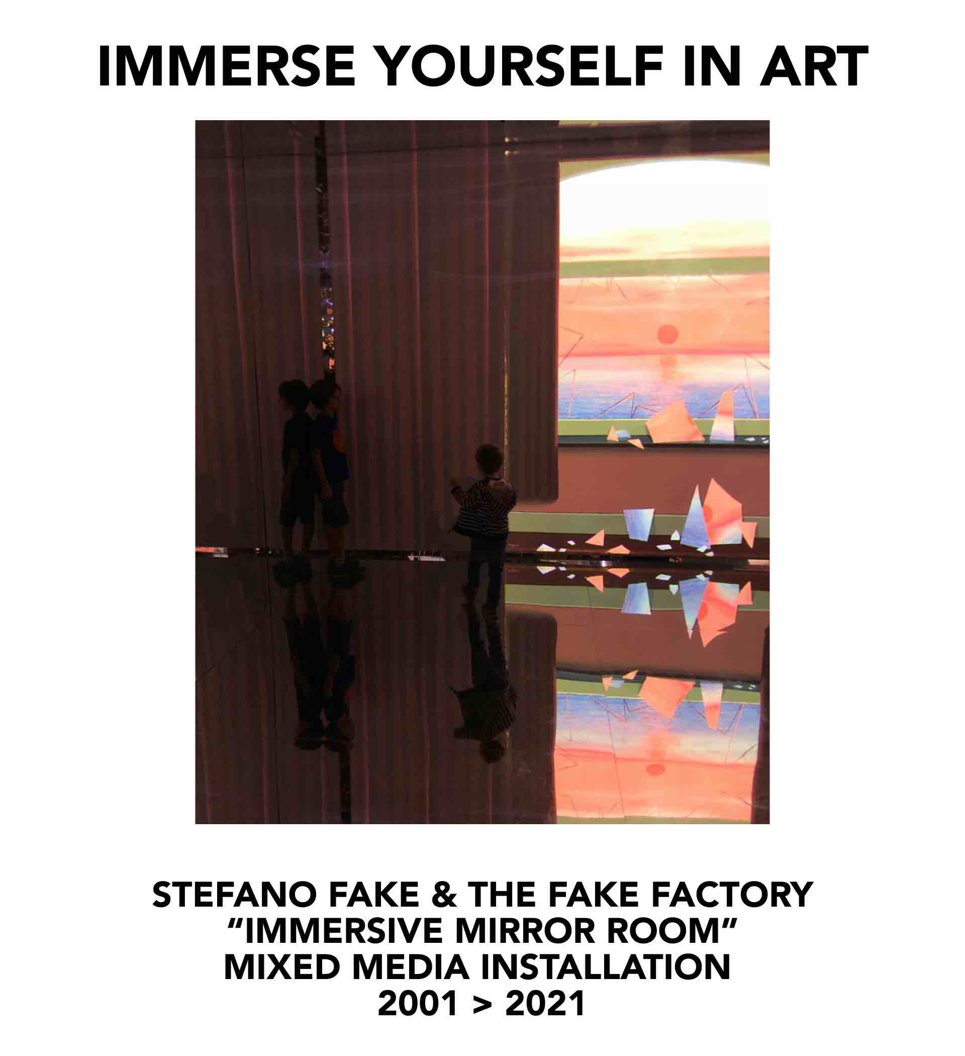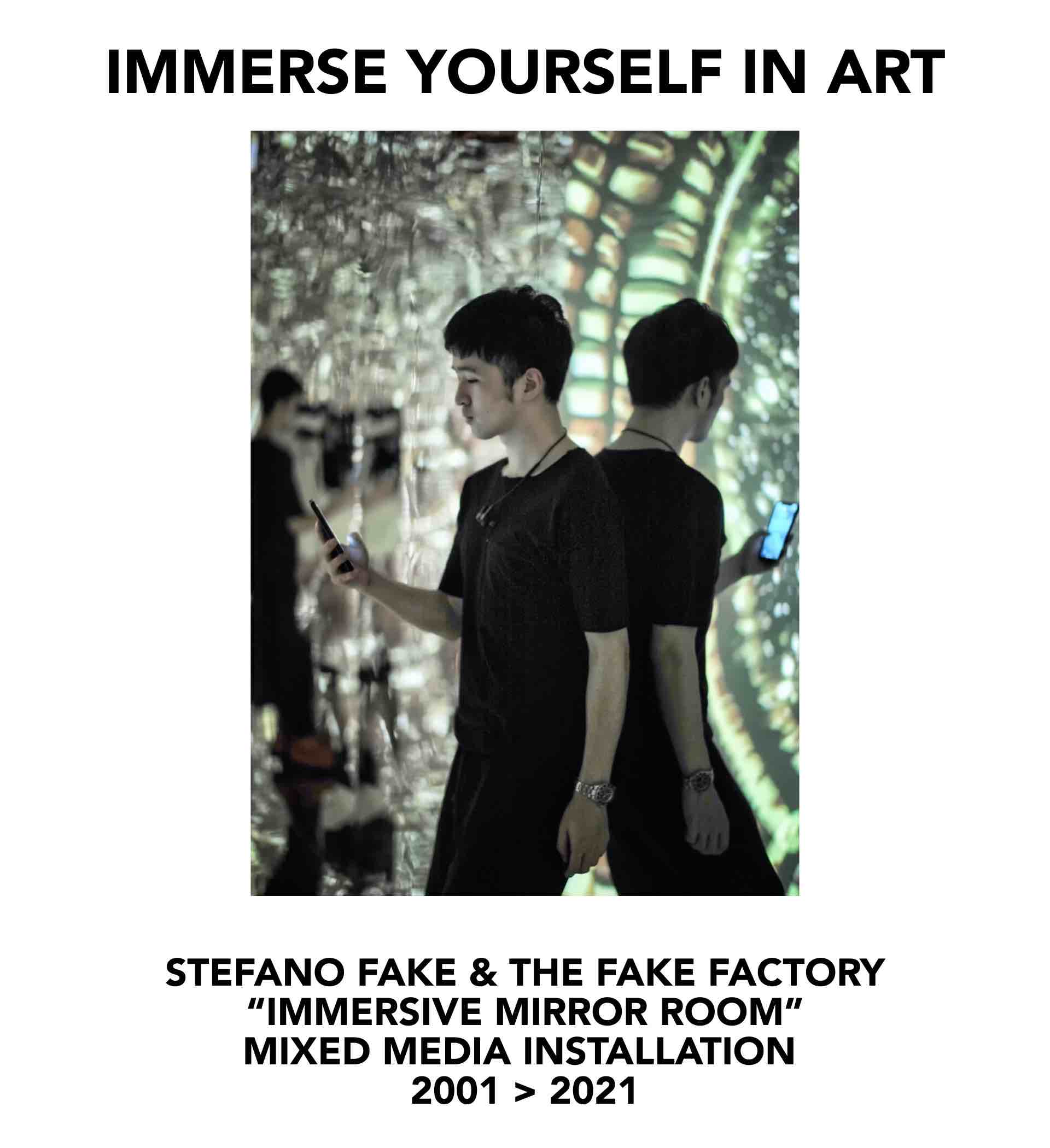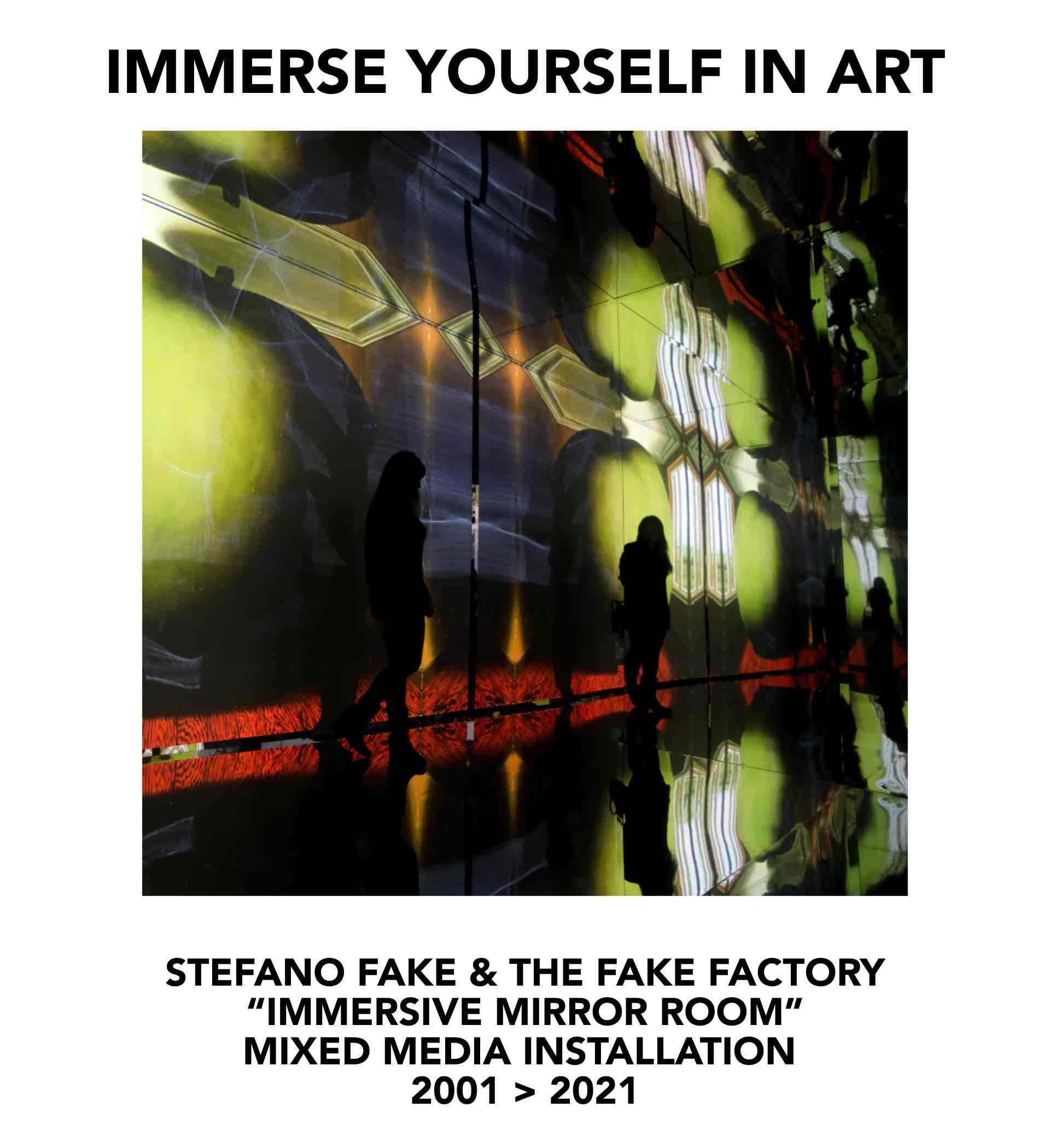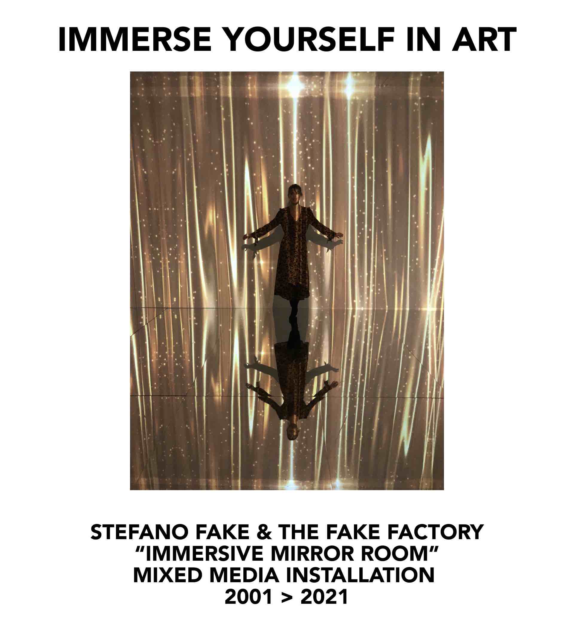 L’installazione “Immersive Mirror Room” è stata creata dall’artista italiano Stefano Fake nel 2001. Già nel 2001 ha iniziato a sviluppare stanze immersive, molto prima che il concetto diventasse una tendenza globale. Le sue immersive mirror rooms hanno attratto milioni di visitatori nel corso degli anni, contribuendo a definire il linguaggio dell’arte digitale e immersiva. Questa innovativa opera d’arte è stata esposta in varie forme sia in Italia che a livello internazionale, all’interno di festival, eventi e mostre innovative. Dal 2001 ad oggi, milioni di persone hanno visitato le immersive mirror rooms create da Stefano Fake & The Fake Factory.