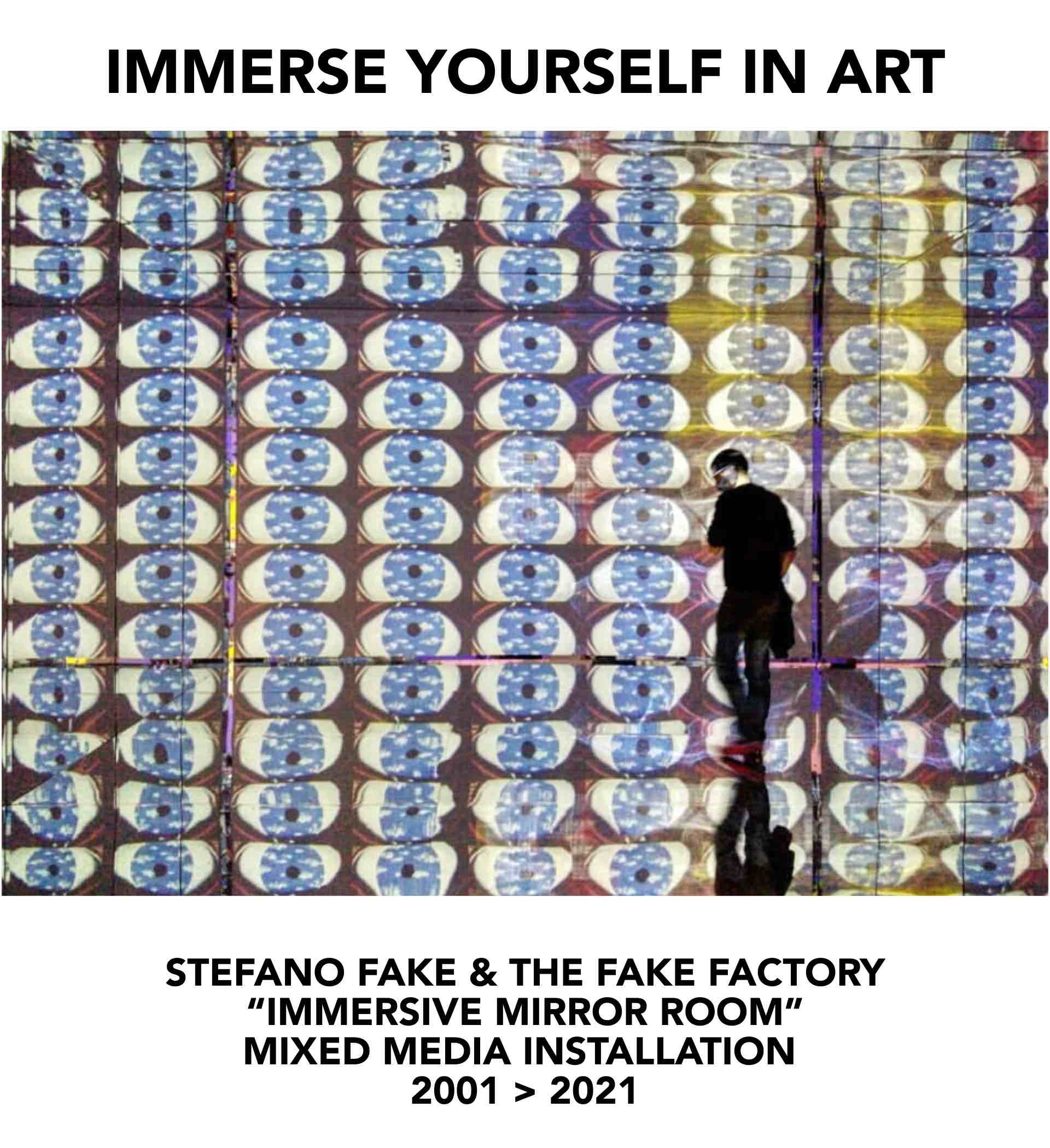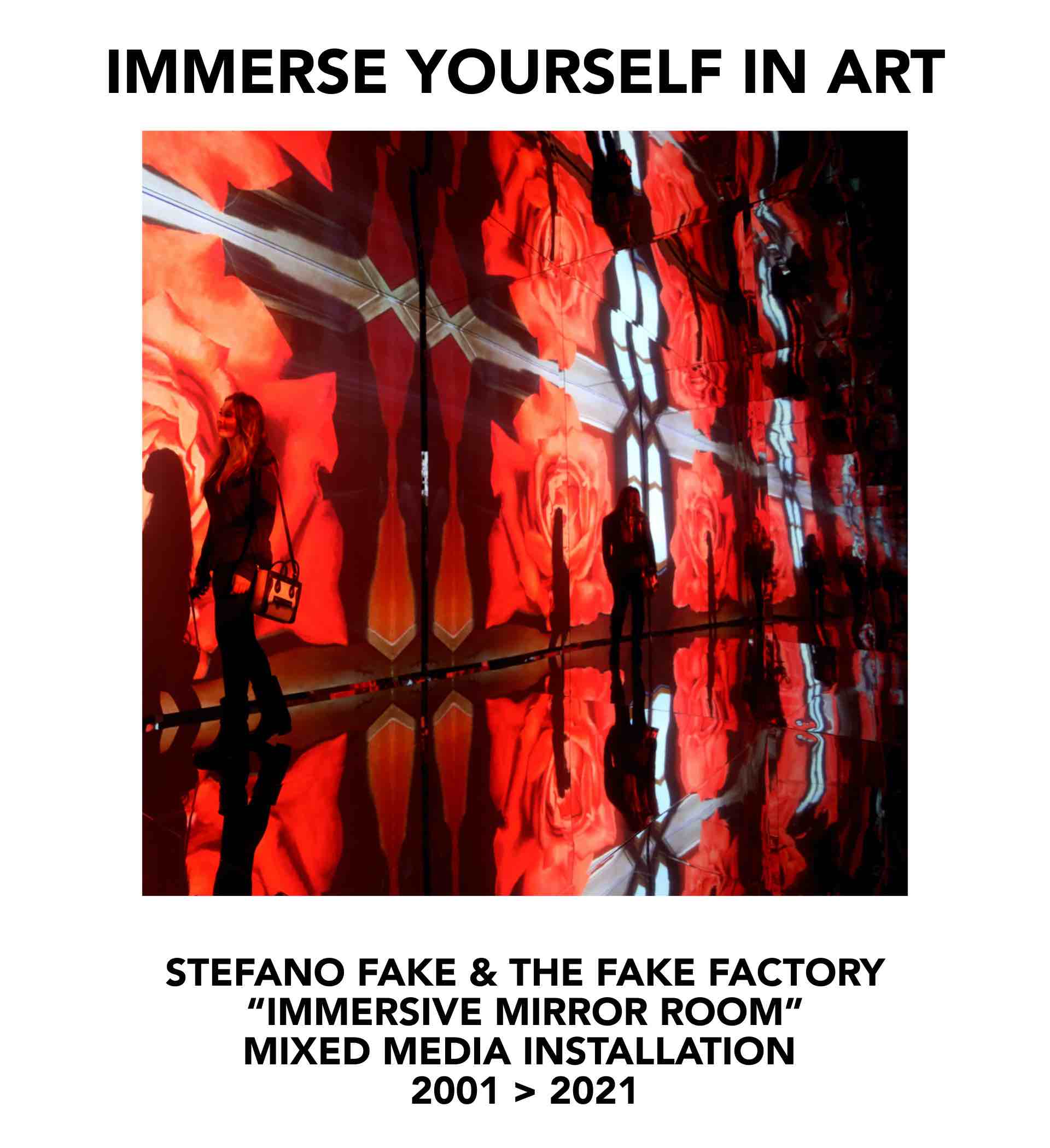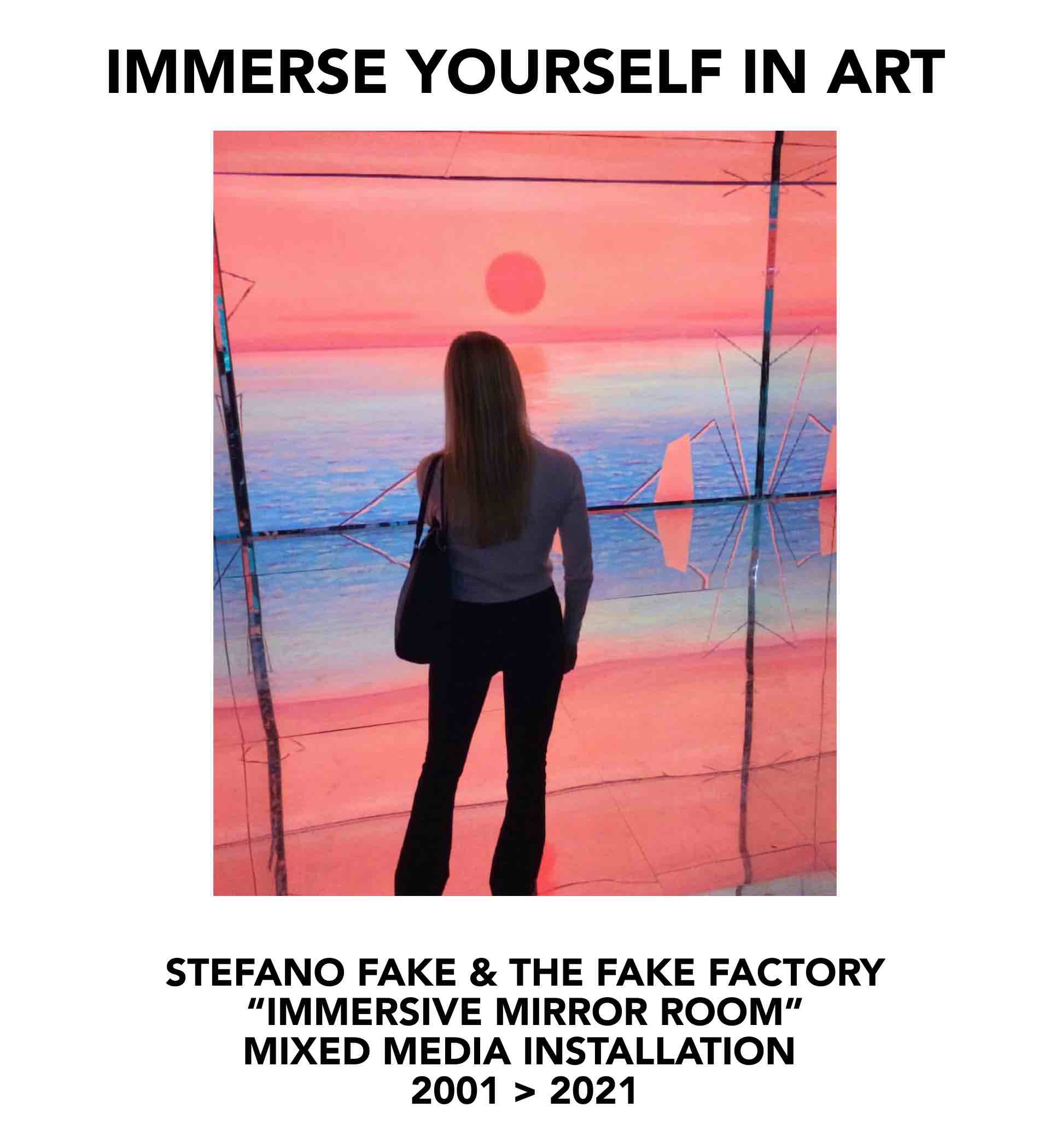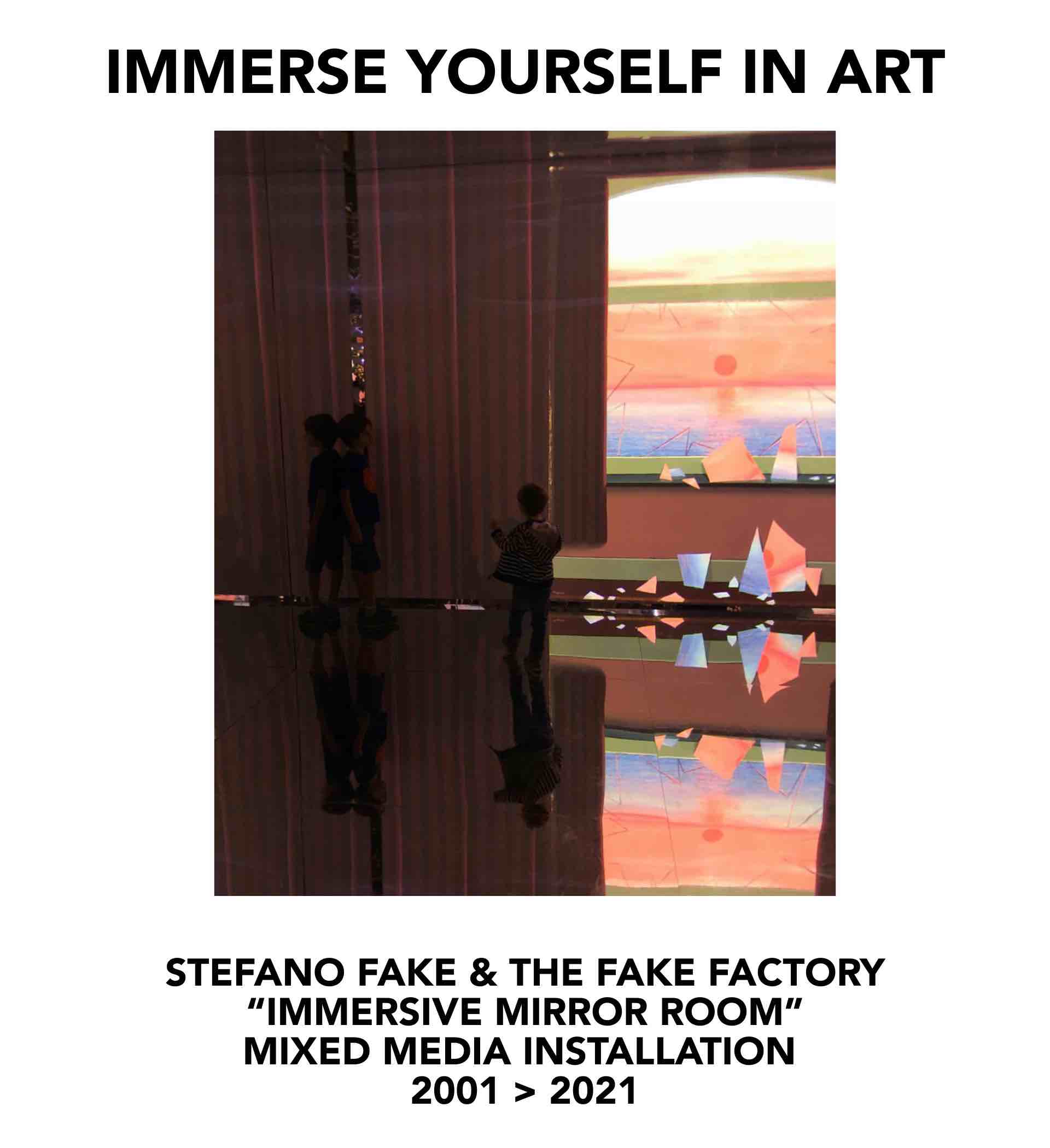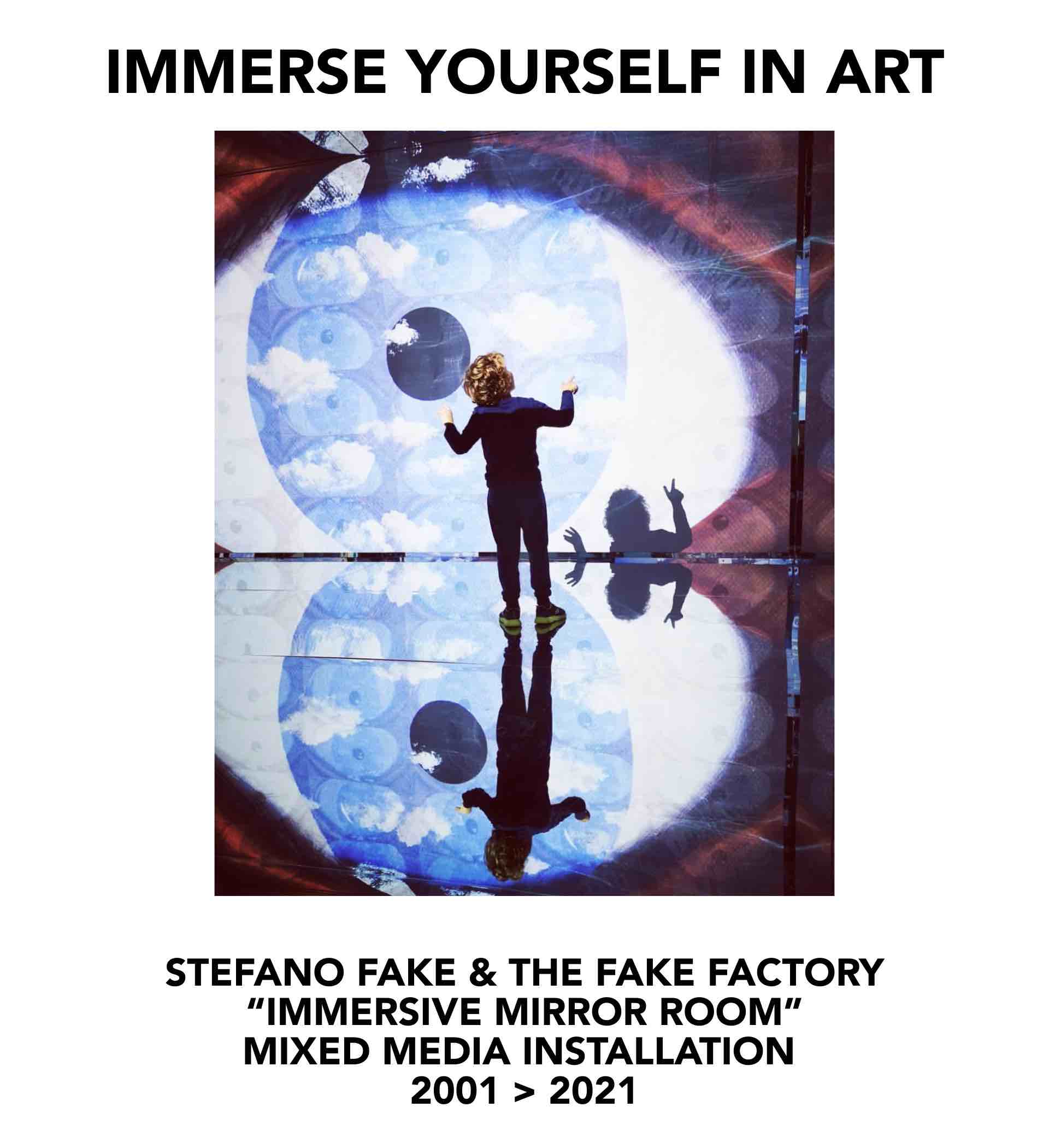 L’installazione “Immersive Mirror Room” è stata creata dall’artista italiano Stefano Fake nel 2001. Già nel 2001 ha iniziato a sviluppare stanze immersive, molto prima che il concetto diventasse una tendenza globale. Le sue immersive mirror rooms hanno attratto milioni di visitatori nel corso degli anni, contribuendo a definire il linguaggio dell’arte digitale e immersiva. Questa innovativa opera d’arte è stata esposta in varie forme sia in Italia che a livello internazionale, all’interno di festival, eventi e mostre innovative. Dal 2001 ad oggi, milioni di persone hanno visitato le immersive mirror rooms create da Stefano Fake & The Fake Factory.