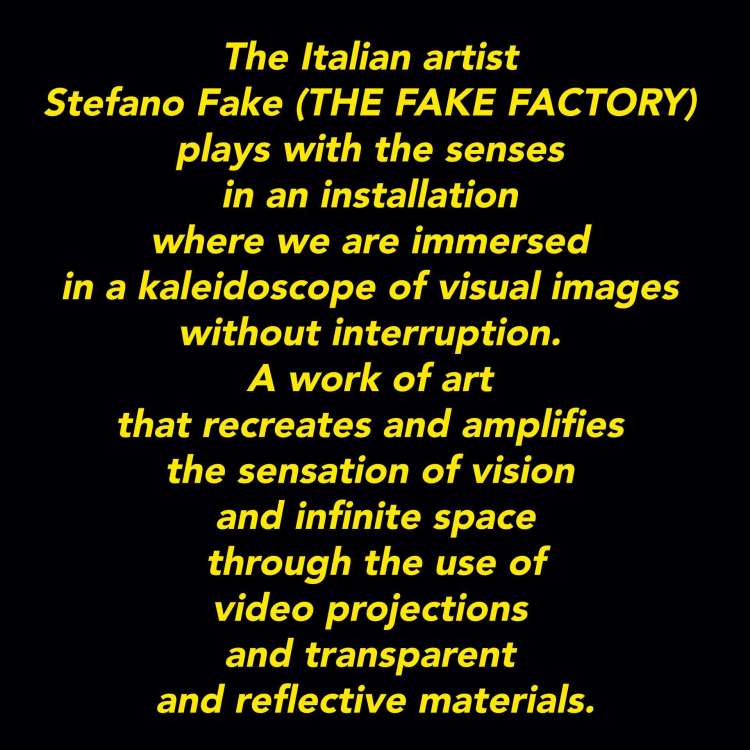 Stefano Fake (THE FAKE FACTORY) gioca con i sensi in un’installazione dove ci si immerge in un caleidoscopio di immagini visive senza soluzione di continuità.Un’opera d’arte che ricrea e amplifica la sensazione della visione e dello spazio infinito attraverso l’uso di videoproiezioni e materiali trasparenti e riflettenti .Mentre il visitatore si muove a suo piacimento nello spazio, le proiezioni lo circondano da ogni parte, confondendo i confini delle pareti con quelli di soffitto e pavimento. Il mondo interiore si amplifica verso l’esterno.Un flusso vitale di immagini in continuo cambiamento avvolge lo spettatore.